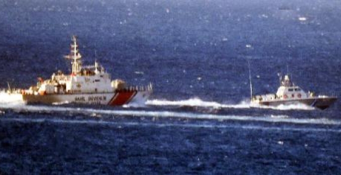Kardak kayalıklarına yakın bölgede avlanan Türk balıkçıları taciz eden Yunan sahil güvenlik botuna, Türk sahil güvenlik botu engel oldu.