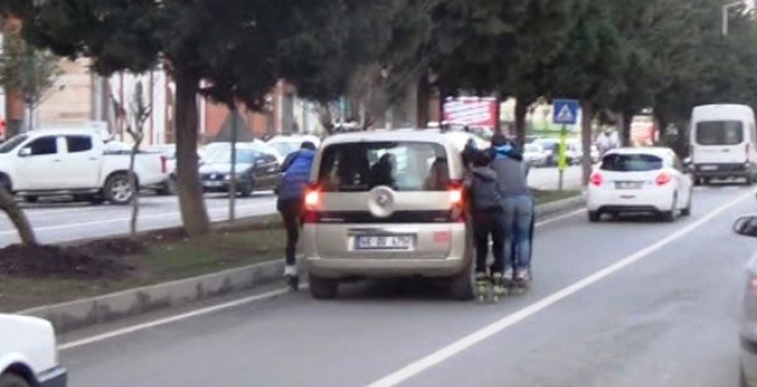 Kahramanmaraş’ta seyir halindeki hafif ticari araca tutunarak seyahat ederken trafik polisine yakalanan gençlere 108’er lira para cezası kesildi.