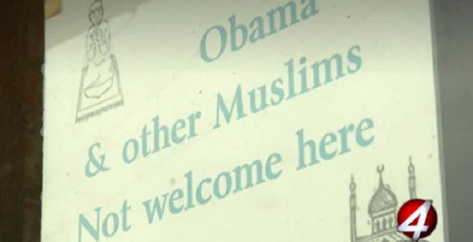 ABD'de bir eyalette dükkan sahibinin penceresine 'Obama ve Müslümanlar burada istenmiyor' afişi asması nefreti körüklediği gerekçesiyle yoğun tepki aldı.