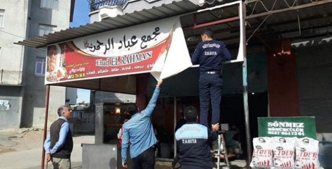 Maraş'ta Suriyeliler tarafından işletilen işletmelerdeki Arapça yazılı tabela ve afişler, zabıta ekiplerince söktürüldü.