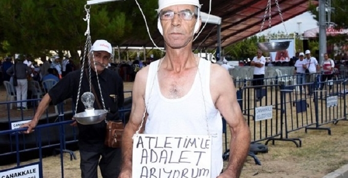 CHP'nin Adalet Kurultayı'nda 'atletli' bir partili, kafasına geçirdiği terazi ile ilginç bir eyleme imza attı.