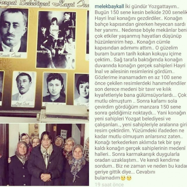 "Konağın duvarında konağın gerçek sahipleri Hayri İnal ve ailesinin resimlerini gördüm… Gözlerime inanamadım en az 100 sene önce çekilen resimlerdeki hanımefendiler son derece medeni bir tavır ve kılık kıyafetleriyle bana gülümsüyorlarlı…