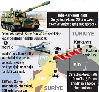 TSK, Suriye sınırında halen 55 bin asker ile 500 zırhlı araç bulunduruyor. Uluslararası koalisyonun ortak kara harekâtına karar vermesi halinde, sınırdaki güçler takviye edilecek. Ankara’nın önerisi Cerablus-Azez hattında 110 km’lik IŞİD’den arındırılmış bölge oluÅŸturulması. Kara harekâtıyla bölgenin IŞİD’den temizlenmesi ve bu alanlara PYD dışındaki muhaliflerin, özellikle de Türkmenlerin yerleÅŸtirilmesi. Böylece bölgede demografik yapının korunması. Suriye sınırının 15 km kadar içine girilecek bir kara harekâtının baÅŸarıya ulaÅŸtırılabilmesi için 4 tugay (20 bin asker) güç kullanımına ihtiyaç olduÄŸu deÄŸerlendiriliyor.