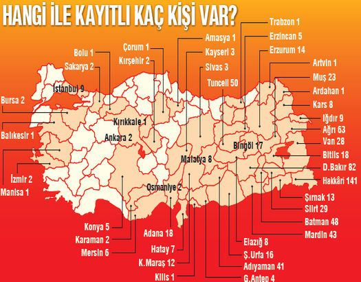 Örgüt üyelerinin yoÄŸun olduÄŸu kentlerin arasında birinci sırayı 141 teröristle Hakkâri alırken, ikinci sırada 82 kiÅŸiyle Diyarbakır, üçüncü sırada 50 kiÅŸiyle Tunceli, dördüncü sırada 48 kiÅŸiyle Batman, beÅŸinci sırada ise 43 kiÅŸiyle Mardin yer aldı. İstanbul’dan 9, Ankara’dan 2 ve İzmir’den 2 teröristin ismi de listede geçiyor. Listede Almanya, Kazakistan, Azerbaycan ve Suriye doÄŸumlu teröristler de yer aldı.