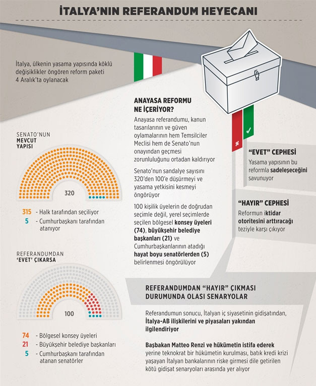 Matteo Renzi, referandumda "Hayır" sonucu çıkması halinde istifa edeceğini söylemişti. Bu durumda ülkenin yeniden siyasi istikrarsızlığa düşmesi ve bunun da tüm AB'yi etkileyebilecek ekonomik sonuçlara yol açması riski bulunuyor.