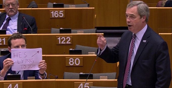 AB karşıtı açıklamaları, sık sık tepki çeken Farage'ın konuşması sırasında İngiliz İşçi Partisinden Seb Dance, üzerinde "Size yalan söylüyor" yazan bir döviz tuttu. Dance'ın bu protestosu, bir AP görevlisinin yanına gelip uyarında bulunmasına kadar sürdü.