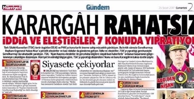 Hürriyet gazetesinin, büyük tepkilere neden olan Cumartesi günkü manÅŸeti, “Karargah rahatsız” için Bakırköy Cumhuriyet BaÅŸsavcılığınca soruÅŸturma baÅŸlatıldı.