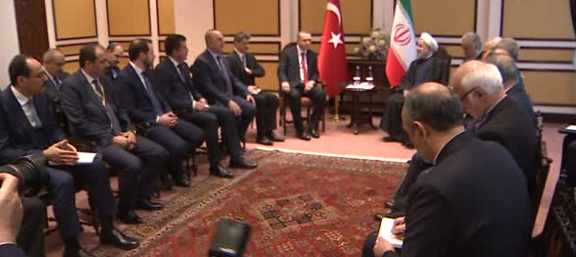 Erdoğan, son olarak İran Cumhurbaşkanı Hasan Ruhani ile bir araya geldi. Görüşmede Dışişleri Bakanı Mevlüt Çavuşoğlu, Enerji ve Tabii Kaynaklar Bakanı Albayrak ve Cumhurbaşkanlığı Sözcüsü İbrahim Kalın da hazır bulundu.