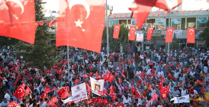 İlçedeki sivil toplum kuruluşları tarafından organize edilen etkinlikte Atatürk Meydanı'nda toplanan binlerce kişi, ellerindeki Türk bayraklarıyla, "Şehitler ölmez, vatan bölünmez", "Kahrolsun PKK", "Vekile uzanan eller kırılsın" şeklinde slogan attı.