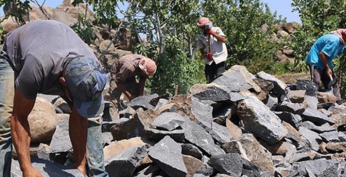 Taş yontma işi yapan Hüner Mansur yaptığı açıklamada, "En az 45 derece sıcaklıkta, güneşin tepede olduğu zamanlarda çalışmak zorunda kalıyoruz. Evimize ekmek götürmek için bunu yapmak zorundayız." dedi.