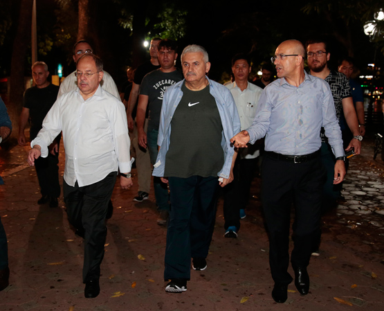 Konakladığı Melia Otel'den Başbakan Yardımcıları Mehmet Şimşek, Recep Akdağ ve kendisini takip eden gazetecilerle yürüyüşe çıkan Yıldırım, Hoan Kiem Gölü yakınlarında bir kafede kahve içti, gazetecilerle sohbet etti.