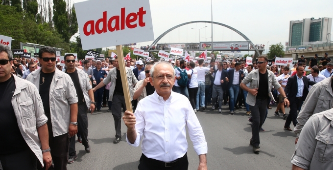 Cumhuriyet Halk Partisi'nin (CHP) Çanakkale'nin Eceabat ilçesine bağlı Kocadere Kamp Alanı'nda dün başlayan ve 4 gün sürecek olan 'Adalet Kurultayı'nda ikinci gün programı kapsamında 57. Alay yürüyüş yolundan Conkbayırı'na yaklaşık 6 kilometre yürüyüş gerçekleştirildi. Kurultayın yapıldığı kamp alanında sabah saat 06.00'da çorba ve hoşaf içilmesinin ardından başlayan yürüyüşte CHP lideri Kemal Kılıçdaroğlu da yer aldı. Conkbayırı Şehitler Anıtı'nda son bulan yürüyüş sonrası Kılıçdaroğlu, anıta üzerinde 'Adalet' yazılı çelenk bıraktı. Saygı duruşunun ardından basın mensuplarına açıklamalarda bulunan Kılıçdaroğlu, şu ifadeleri kullandı: