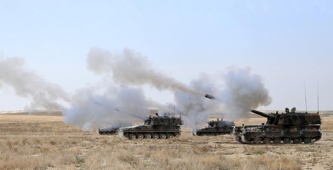 Türk Silahlı Kuvvetleri'nin Afrin'e yönelik operasyon hazırlığını sürdürürken Hatay'ın Hassa ilçesinin sınır karakollarından 10 top atışı yapıldı.