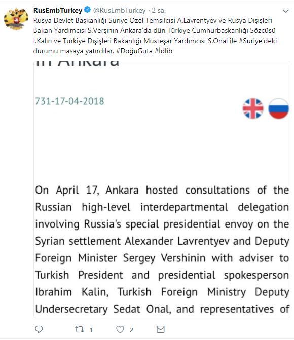Rusya'nın Ankara Büyükelçiliği'nin Twitter hesabından yapılan açıklamada Rusya Devlet Başkanlığı Suriye Özel Temsilcisi Alexander Lavrentyev ve Rusya Dışişleri Bakan Yardımcısı Sergey Vershinin'in dün Ankara'da Cumhurbaşkanlığı Sözcüsü İbrahim Kalın ve Dışişleri Bakanlığı Müsteşar Yardımcısı Sedat Önal ile görüştüğü belirtildi.