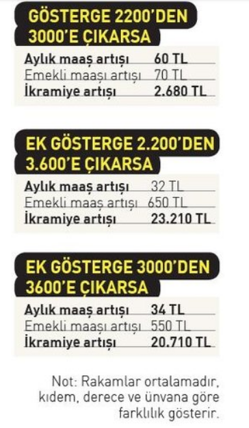 Memurların maaÅŸ hesabında kullanılan ölçütlerden birisi olan ek göstergedeki artış mevcut maaÅŸları artırmakla birlikte asıl etkiyi emeklilik ikramiyesine ve emekli maaşına yapıyor. Ek gösterge rakamları unvan, hizmet sınıfı ve derecelere göre farklılık gösteriyor. Ek göstergesi 3600 olan bir memur ile daha düÅŸük olan bir memurun alacağı zam ya da maaÅŸ miktarı aynı olmuyor. Ek göstergelerin 2200'den 3000'e ve 3600'e çıkarılmasıyla birlikte polis, öÄŸretmen, hemÅŸire, din görevlisi ve idarecilerin emeklilik ikramiyeleri ve emekli maaÅŸları ciddi oranda artacak.