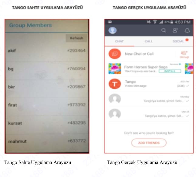 MesajlaÅŸma uygulamalarındaki sahte ve gerçek uygulama ara yüzlerinin görsellerinin eklendiÄŸi iddianamede, "Uygulamaların 'abi' olarak tabir edilen ve örgüt içerisindeki bir üst konumundaki kiÅŸi tarafından bluetooth ya da mail yolu ile gönderilen link üzerinden kurulduÄŸu, uygulamalarla birlikte uluslararası güvenliÄŸi test edilen Tor, Orbot, SuperVpn, Hma Vpn tarzı vpn ve proxy programlarının kurulu olduÄŸu, yapılan sohbet ve yazışmaların içeriÄŸinin belli aralıklarla (yazıldıktan sonra hemen, 1, 2, 3 gün) kendini silmeye programlandığı, uygulamalara giriÅŸ ÅŸifrelerinin genellikle harf, rakam ve sembollerden oluÅŸan 16-24 arası karakter taşıdığından; mülakat veya sorguda verilen ÅŸifrelere itibar edilmemesi gerektiÄŸi, örgüt mensubunun gözaltına alınması ya da herhangi bir ÅŸüphe durumunda uzaktan eriÅŸim yoluyla uygulamanın kaldırılabildiÄŸi, tüm mobil cihazlarda (tablet, cep telefonu vb.) yanlış ÅŸifre, internete baÄŸlanma, ÅŸarjın tümüyle bitmesi gibi durumlarda; uygulamaların baÅŸkasının eline geçtiÄŸi ÅŸüphesi ile Wipe yapılarak geri getirilemeyecek ÅŸekilde silmeye programlanmış olduÄŸu tespit edilmiÅŸtir" denildi.