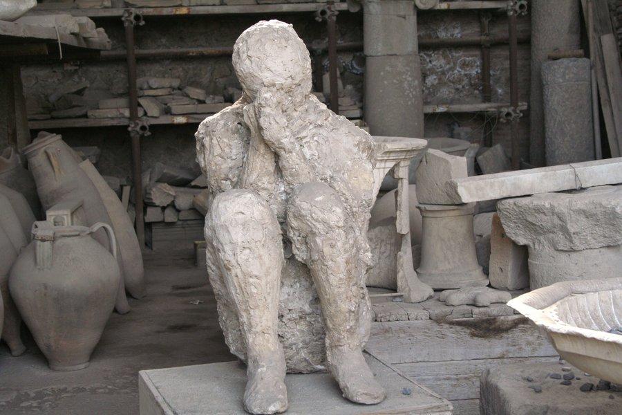 Pompei halkının kazılar sırasında taÅŸ olarak çıkarıldıkları vakit ölüm anında ne yapıyorlarsa o halde bulundular. Kimi başını ellerinin arasına alarak çaresiz bir ÅŸekilde lavların karşısına oturur vaziyette, kiminin ÅŸehrin fuhuÅŸ yuvalarında, bazılarının da çocuklarıyla lavların altında kaldığı.