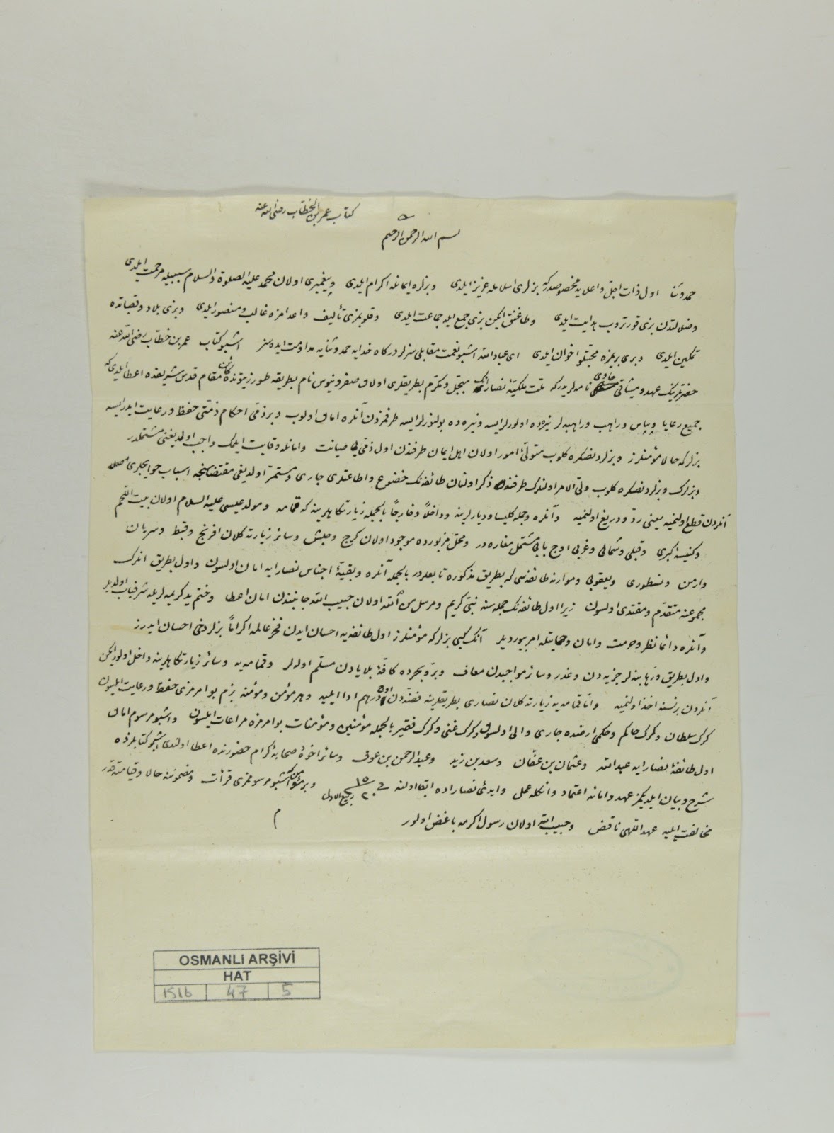 [5] BaÅŸbakanlık Osmanlı ArÅŸivi Hatt-ı Hümayun Tasnifi (BOA. HAT.) 1516/47 (5).