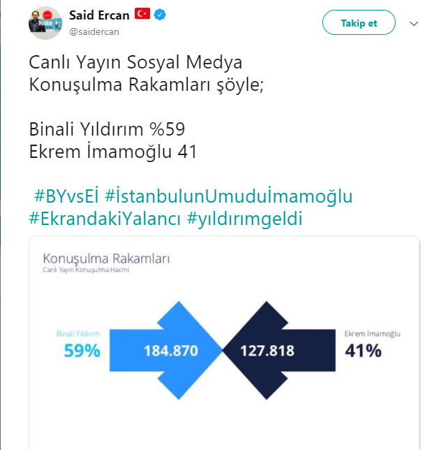 Said Ercan: Canlı Yayın Sosyal Medya Konuşulma Rakamları şöyle; Binali Yıldırım %59 Ekrem İmamoğlu 41