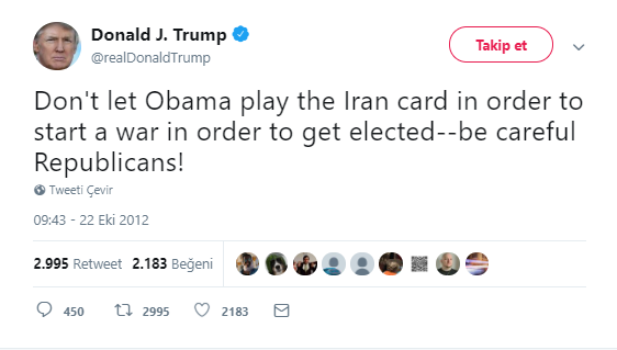 ABD Bakanı Donald Trump 2002 yılında attığı bir tweette: "Cumhuriyetçiler dikkatli olun! Sakın Obama'nın İran kartı oyununa gelmeyin savaş açmayı tekrar seçilmek için planlıyor." dediği tweet Amerikan basınında tekrar gündem oldu.
