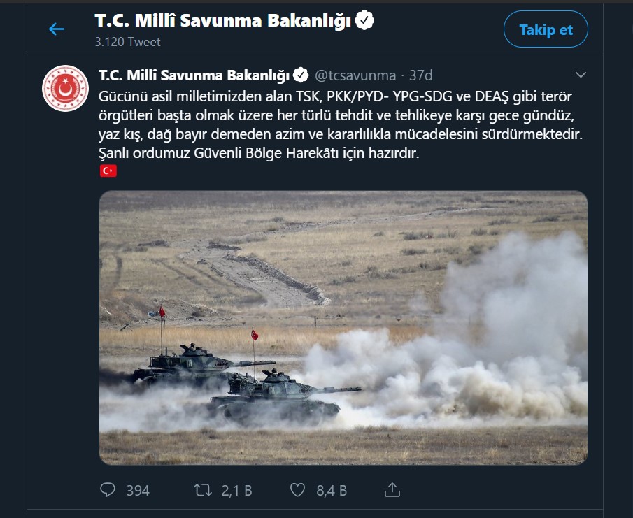 Milli Savunma Bakanlığı Twitter'dan yaptığı paylaşımda, "Şanlı ordumuz Güvenli Bölge Harekatı için hazırdır" dedi.