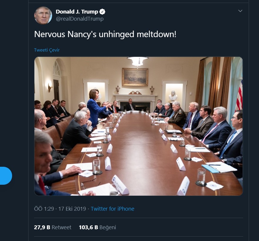 Trump ikinci paylaşımında ise Pelosi'nin ayakta konuÅŸurken görüldüÄŸü fotoÄŸrafı paylaÅŸarak, "Asabi Nancy sinirden deliye döndü" notunu düÅŸtü.