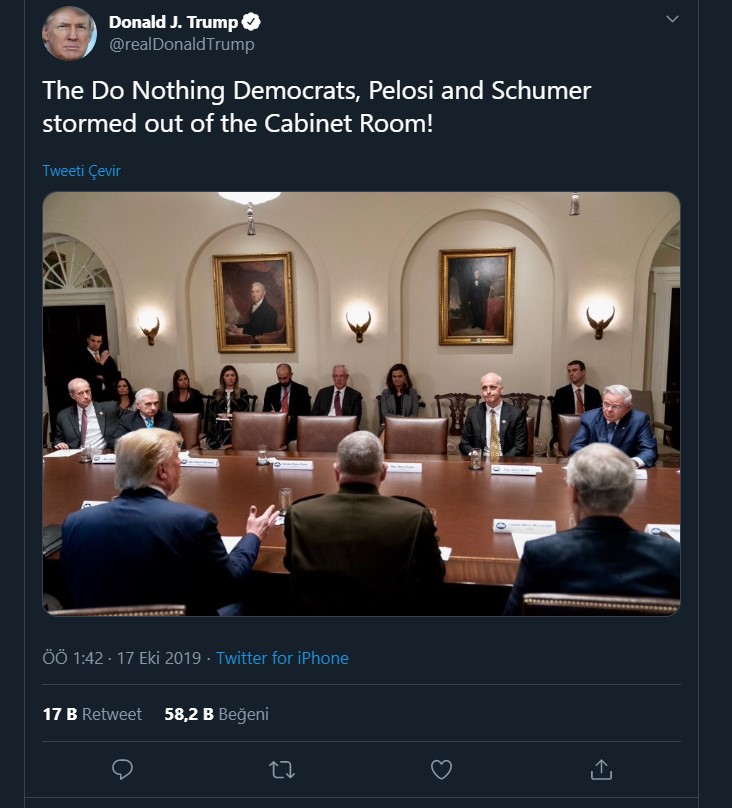 Yaptığı üçüncü paylaşımda ise Pelosi, Schumer ve Hoyer'in koltuklarının boÅŸ olduÄŸu fotoÄŸrafa yer veren Trump, "Hiçbir ÅŸey yapmayan Demokratlar, Pelosi ve Schumer kabine odasından hışımla çıktı" bilgisini paylaÅŸtı.