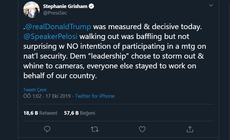 Beyaz Saray Sözcüsü Stephanie Grisham da toplantıya iliÅŸkin Twitter'dan yaptığı açıklamada, "Trump bugünkü toplantıda ölçülü ve kararlıydı. Pelosi'nin toplantıyı terk etmesi ÅŸaşırtıcıydı ancak ulusal güvenlik konusundaki bir toplantıya katılma niyeti göstermediÄŸinden sürpriz olmadı. Demokrat liderler toplantıyı hışımla terk etmeyi ve kameralar önünde sızlanmayı seçti. DiÄŸer herkes odada kaldı ve ülkemiz adına çalıştı" deÄŸerlendirmesinde bulundu.
