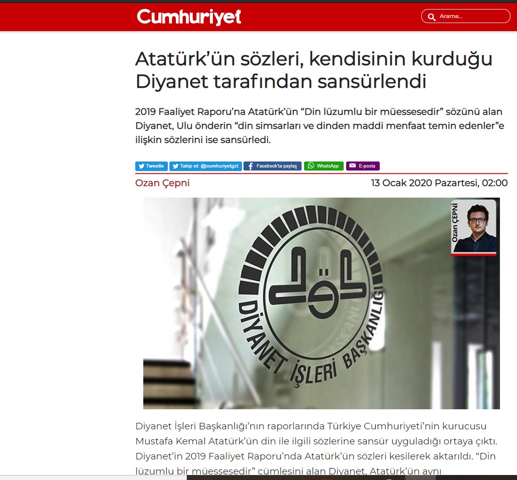 Cumhuriyet gazetesinin haber başlığı: “Atatürk’ün sözleri, kendisinin kurduğu Diyanet tarafından sansürlendi.”