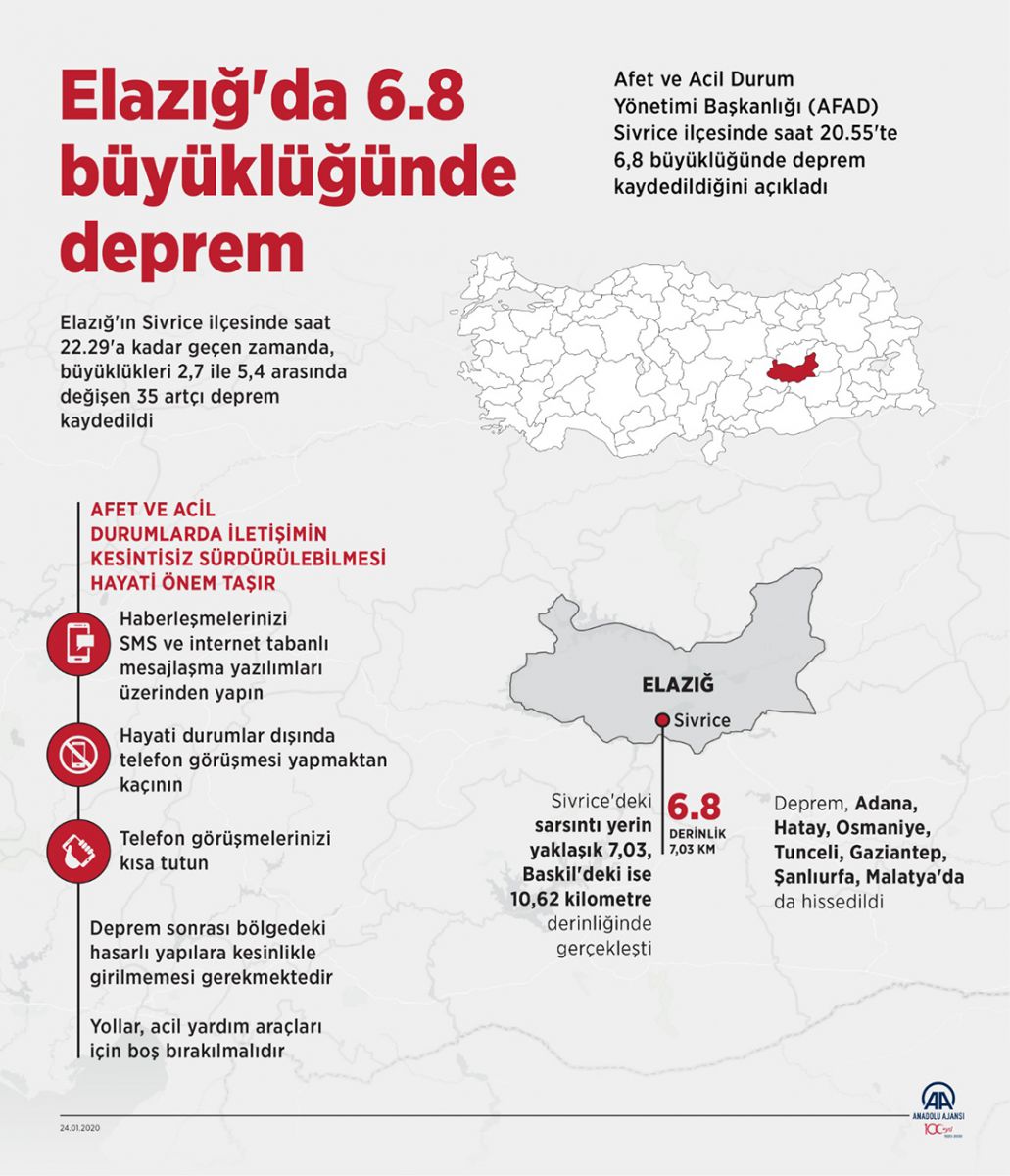 AFAD açıklamasına göre Sivrice ilçesinde saat 20.55'te 6,8 büyüklüÄŸünde deprem kaydedilmiÅŸti.