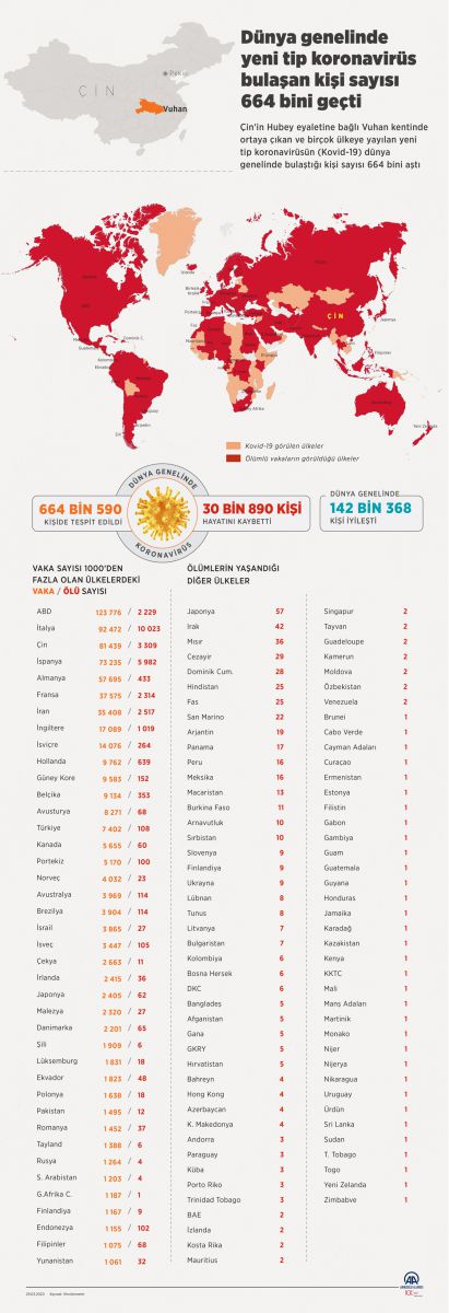 Çin'in Hubey eyaletine bağlı Vuhan kentinde ortaya çıkan ve birçok ülkeye yayılan yeni tip koronavirüsün dünya genelinde bulaştığı kişi sayısı 664 bini aşarken, Kovid-19 nedeniyle toplam 30 bin 890 kişi de hayatını kaybetti.