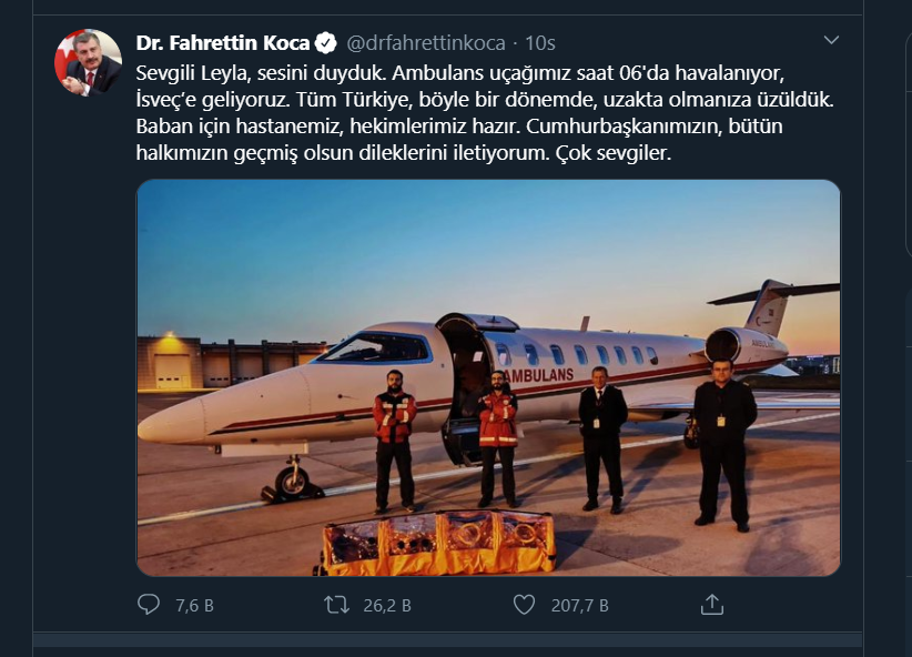 Leyla GülüÅŸken, yetkililerin haberi aldıktan sonra kendilerini aradığını ifade ederek "Haberimiz Anadolu Ajansında yayımlandıktan sonra onlarca yetkiliden telefon aldık. SaÄŸlık Bakanı Fahrettin Koca bize kısa sürede uçak gönderdi. Ülkemizle gurur duyuyoruz." dedi.