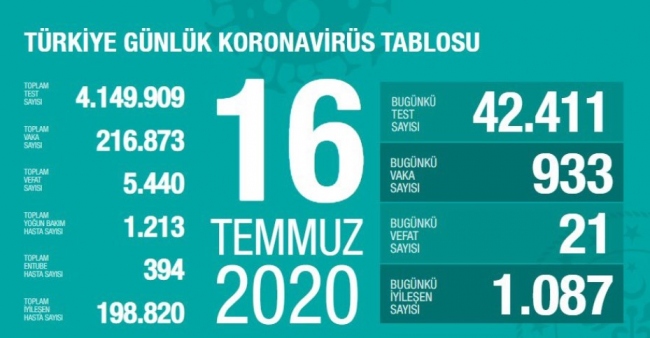 SaÄŸlık Bakanlığının internet sitesinde yer alan ve Bakan Fahrettin Koca'nın da Twitter'dan paylaÅŸtığı "Türkiye Günlük Koronavirüs Tablosu"nun güncel verilerine göre, bugün 42 bin 411 test yapıldı, 933 kiÅŸiye Kovid-19 tanısı konuldu. Son 24 saatte 21 hasta vefat etti, 1087 kiÅŸi iyileÅŸti.