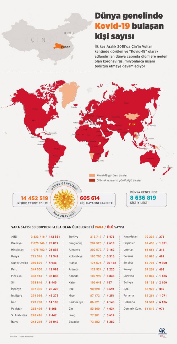 Dünya genelinde yeni tip koronavirüs (Kovid-19) salgınında vaka sayısı 14 milyon 537 bine ulaşırken, can kaybı 606 bin 898'e, iyileşenlerin sayısı 8 milyon 680 bine yükseldi.