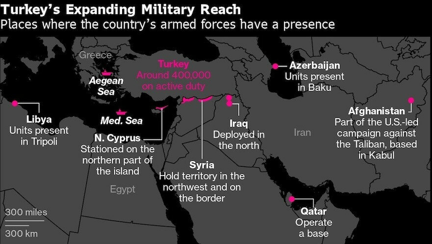 Türk askerinin Suriye, Katar, Irak, Somali ve Balkanlar'da varlık gösterdiÄŸi ifade edilen yazıda, "Türkiye Libya'da savaşın dengesini deÄŸiÅŸtirmek için asker gönderdi. Aynı zamanda, Akdeniz ve Ege'de devriye atıyor" denildi.