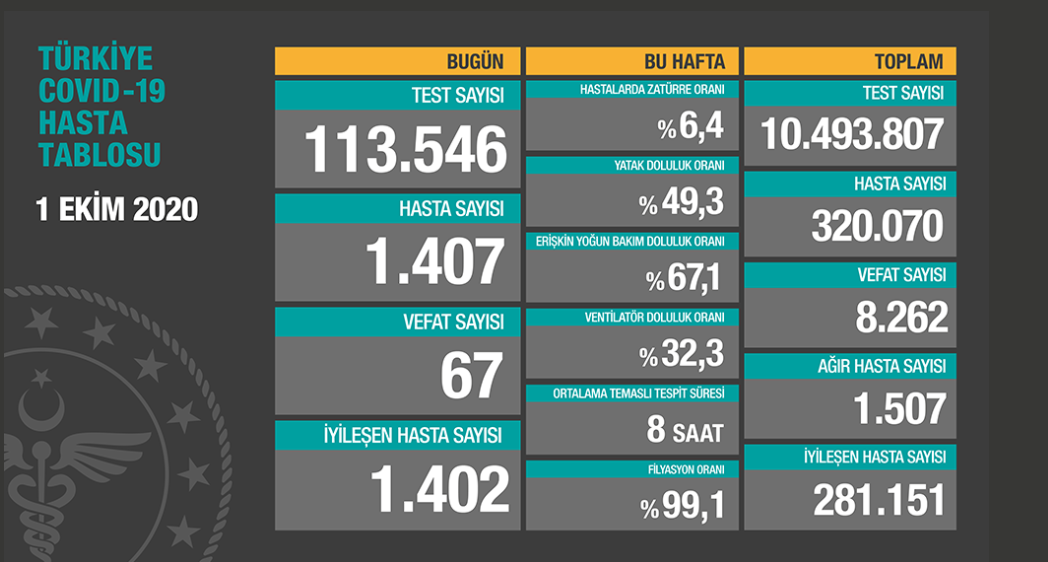 Türkiye'de son 24 saatte 113 bin 546 Kovid-19 testi yapıldı, 1407 kişiye hastalık tanısı konuldu, 67 kişi Kovid-19 nedeniyle hayatını kaybetti, ağır hasta sayısı 1507 oldu.