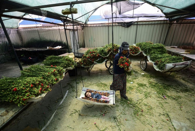 Anneler günü Anneler Günü öncesinde Antalya\'daki çiçek seralarında ve depolarında büyük bir yoğunluk yaşandı. Bir yandan çocuklarının ihtiyaçlarını karşılayan, bir yandan da dünya annelerine verilecek çiçekleri özenle hazırlayan kadınlar, hiç tanımadıkları hemcinslerinin yüzünü güldürecek çiçekleri hazırladı. Tokat\'tan Antalya\'ya eşi Murat Demir ile gelerek 8 yıldır çiçek seralarında çalışan Ayşe Demir, 10 aylık kızı Hira Nur\'un (fotoğrafta) çiçeklerin arasında büyüdüğünü söyledi. Süleyman Elçin