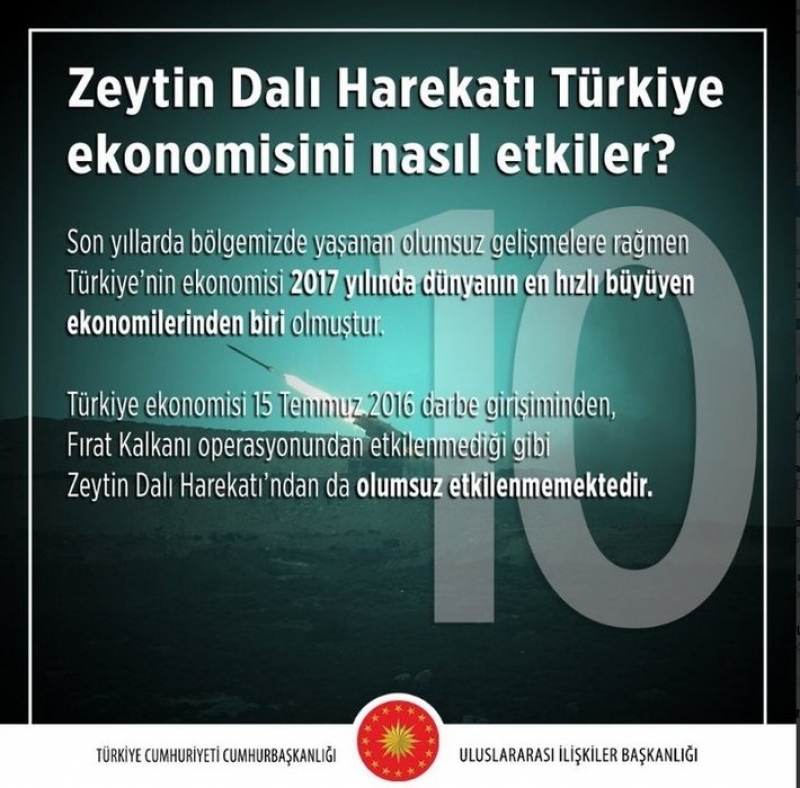 Cumhurbaşkanlığı, sosyal paylaşım sitesi Twitter'daki hesaplarından "Zeytin Dalı Harekatı"na ilişkin 10 soruyu cevaplayan bilgi kartları yayınladı. Bilgi kartlarında harekatın hukuki dayanaklarından amaçlarına, ekonomiye etkilerinden insani yardımlara kadar birçok konuda kısa açıklamalara yer verildi. Kartların arka planında, harekattan fotoğraflar da kullanıldı. Bilgi kartları aynı zamanda Cumhurbaşkanlığının İngilizce Twitter hesabından İngilizce olarak da paylaşıldı.