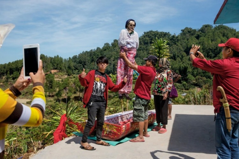2011 yılında ölen Cristina Banne, oğlu Bartolomeus Bunga' tarafından havaya kaldırılırken torunu Jerry Putra Bunga' onaylama işareti yapıyor. Torajaların yarıdan çoğu başka yerlerde yaşıyor ve sonuçta cenazeler aileleri yeniden bir araya getirmek gibi bir işlev de üstleniyor.