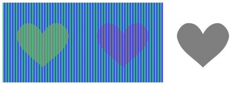 Soldaki kalp yeşil, sağdaki pembe görünüyor ama gerçekte ikisi de gri.