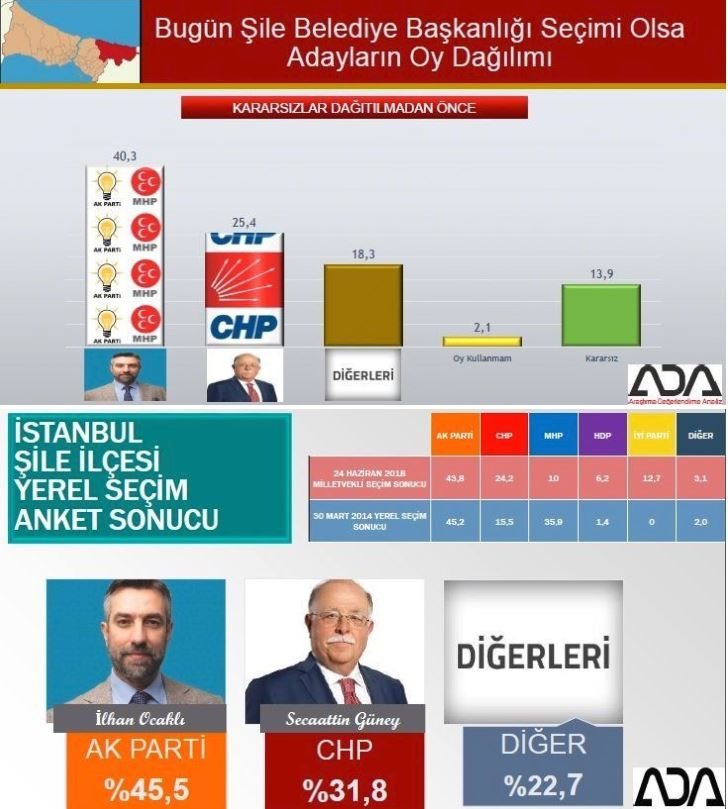 Araştırma Değerlendirme Analiz (ADA) araştırma şirketi, 31 Mart yerel seçimlerine ilişkin İstanbul'un 39 ilçesini kapsayan geniş çaplı bir anket yayınlandı.
