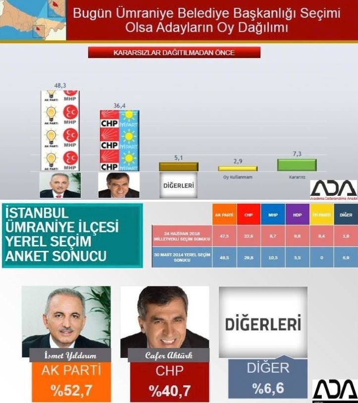 Araştırma Değerlendirme Analiz (ADA) araştırma şirketi, 31 Mart yerel seçimlerine ilişkin İstanbul'un 39 ilçesini kapsayan geniş çaplı bir anket yayınlandı.