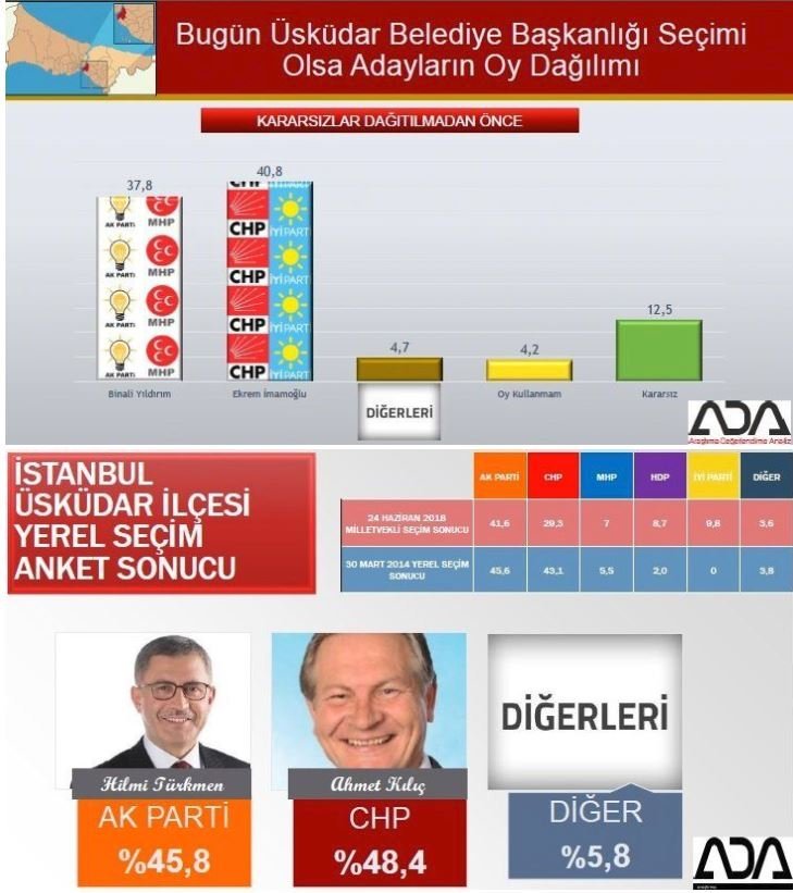 Araştırma Değerlendirme Analiz (ADA) araştırma şirketi, 31 Mart yerel seçimlerine ilişkin İstanbul'un 39 ilçesini kapsayan geniş çaplı bir anket yayınlandı.