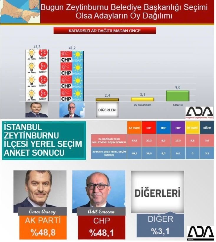 Araştırma Değerlendirme Analiz (ADA) araştırma şirketi, 31 Mart yerel seçimlerine ilişkin İstanbul'un 39 ilçesini kapsayan geniş çaplı bir anket yayınlandı.