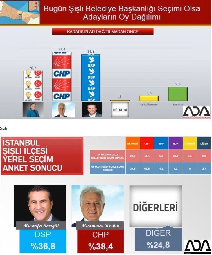 Araştırma Değerlendirme Analiz (ADA) araştırma şirketi, 31 Mart yerel seçimlerine ilişkin İstanbul'un 39 ilçesini kapsayan geniş çaplı bir anket yayınlandı.