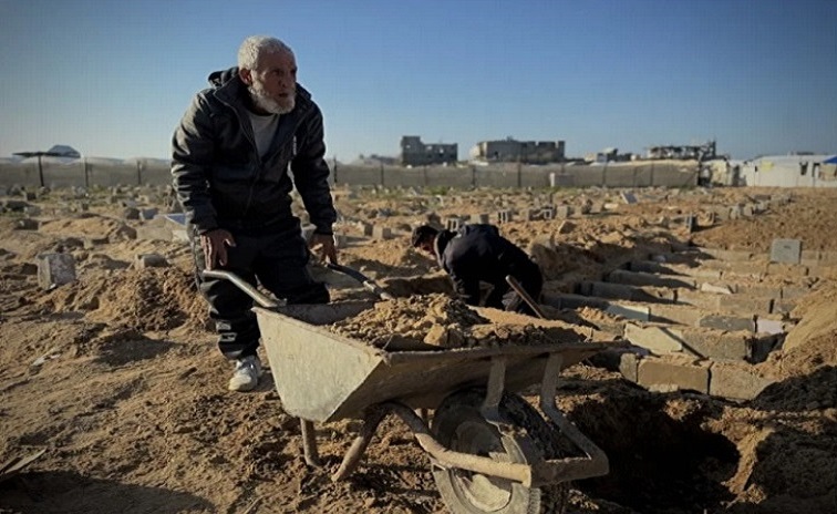 Gazze'deki resmi mezarlıklar çoktan kapasitesini doldurduğu için eski aile kabirlerini açmış, hastane bahçelerinde, pazar yerlerinde ve okul avlularında geçici defin alanları oluşturmuş. Defin sonrası "Mezar Taşı" yerineyıkılan binaların enkazından toplanan beton blokları, tahta parçalarını kullanmış. Bulduğu kartonlar üzerine isim veya numara yazmış.Kumaş kıtlığı nedeniyle bazen cenazeleri kefen yerine plastik örtülerle, battaniyelerle ya da kıyafetleriyle gömmek zorunda kalmış.Toplu definlerde,yakıt sıkıntısı ve saldırılar nedeniyle kepçe kullanılamadığı için günde 15-16 saat boyunca sadece kürek ve elleriyle kazı yapmış.